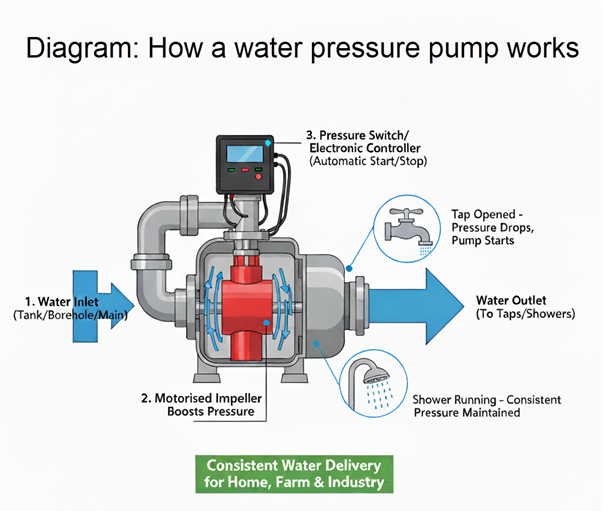 - The pump draws water from a tank, borehole, or main supply.