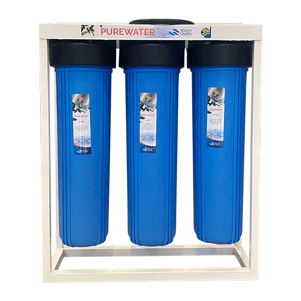 20″ Big Blue Triple Water Filter. This system consists of 2 x Polypropylene Sediment Removal filters and an Activated Carbon Block filter. The Triple Stage Whole House System is a simple way of removing unwanted particles from the water supply to your home designed for the filtration of municipal water.