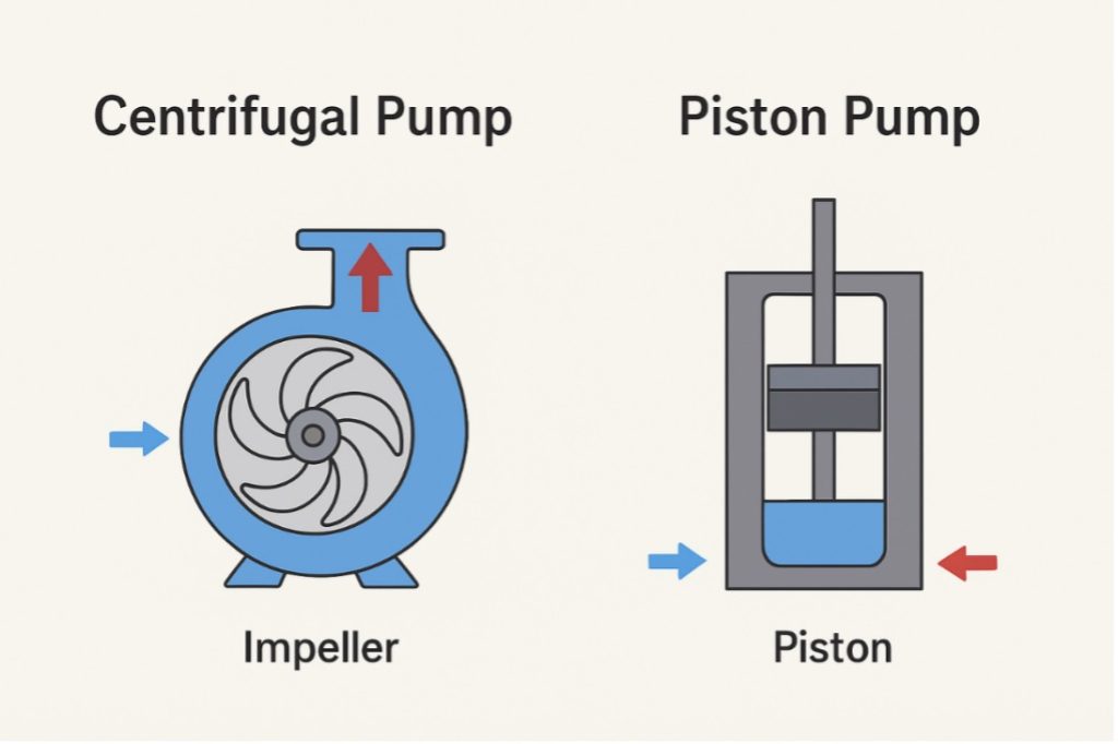 - Positive displacement pump (piston type) – Moves a fixed amount of fluid with each stroke, suited to high-pressure, low-flow applications.
